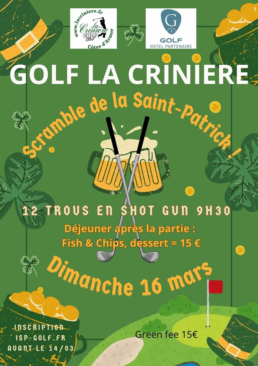 Nouvelle journée de convivialité pour célébrer la culture irlandaise : dimanche 16/03 en scramble 12 trous! Shot gun 9h30 et repas convivial au retour : fish and chips, dessert!