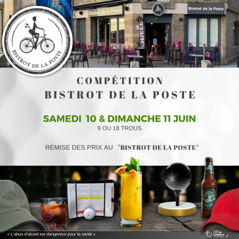 Pour la 2ème année, retrouvons la compétition "Bistrot de la Poste" Saint-Brieuc. Vous avez le choix de jouer 9 ou 18 trous. Le samedi matin, dimanche matin ou après-midi.