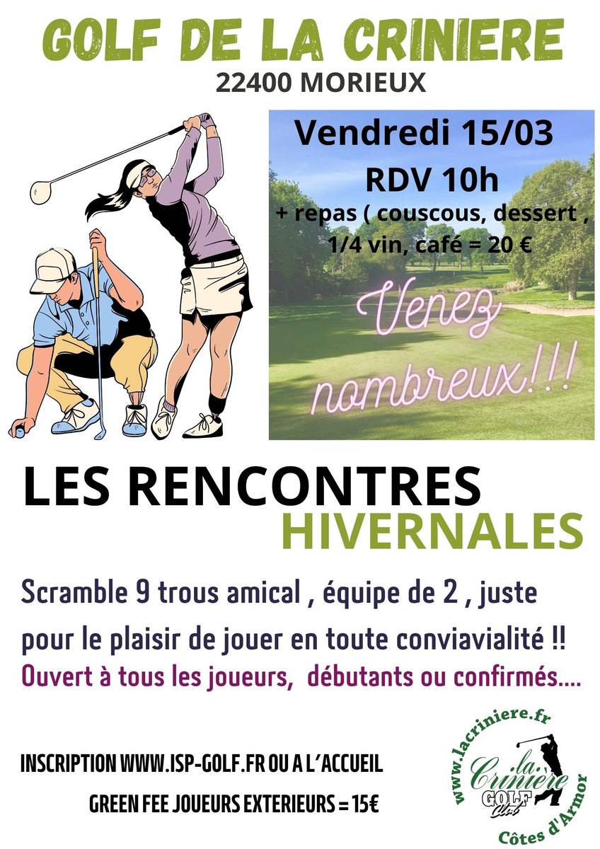 Le Vendredi 15/03 : Rencontre hivernale en scramble 9 trous à 9h30 + repas (couscous, dessert , 1/4 vin, café = 20€) Ouvert à tous joueurs du club, confirmés, débutants, nouveaux, par équipe de 2, un moment de rencontre festif!