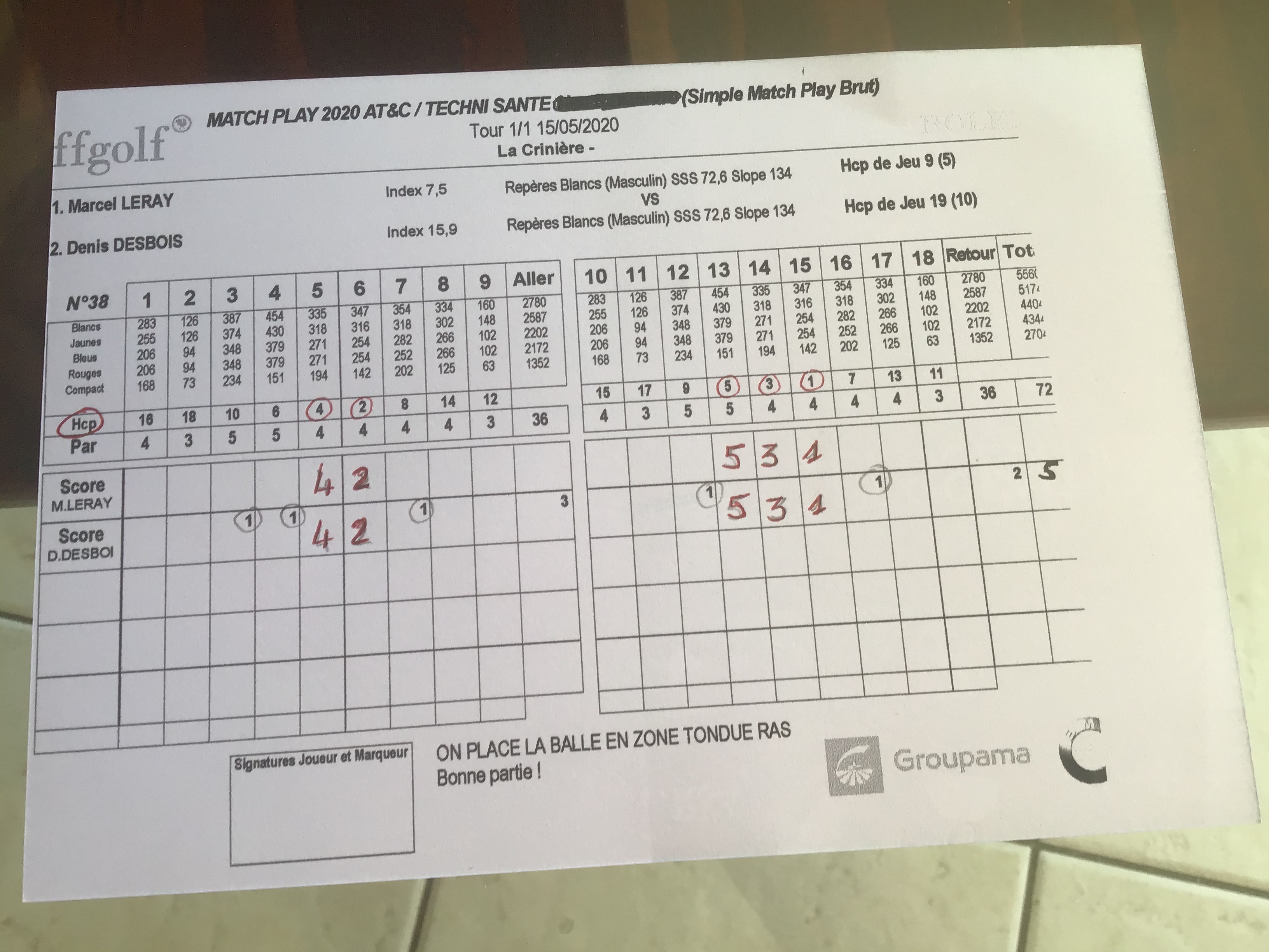 Les coups numérotés en rouge de 1 à 5 sont les coups que recevraient chacun des joueurs en match simple (50% des coups en match play :voir règlement)
